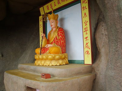 จะเห็นทางขึ้นไปยังถ้ำ อยู่ด้านหลังของรูปปั้นเทวรูป